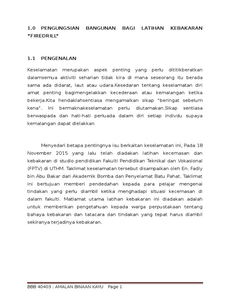Kita sering menonton di kaca televisyen atau membaca di dada-dada akhbar dan laman sosial berkenaan kejadian tragik dan ngeri yang mengakibatkan pekerja dan orang awam terkorban disebabkan aktiviti-aktiviti pekerjaan di tapak pembinaan. 3 Keselamatan kebakaran Pasangkan alat pemadam api dan hos di tempat kerja dan pastikan ianya selalu diperiksa Tandakan tempat berkumpul semasa kecemasan Paparkan pelan evakuasi semasa kecemasan Lakukan latihan kebakaran dengan bantuan pihak bomba. Kemalangan Di Tempat Kerja Meliputi kemalangan yang.